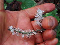| 多年草 草丈:50cm〜80cm 花期:10月 生育場所:山野、湿った場所など 特徴:葉は根生葉のみで3出複葉。多数の雄しべが目立つ白い花穂をつける。 名前の由来:食用になる「サラシナショウマ」に似ているが、食用にならないため「役にたたない」という意味で「イヌ」と付けられた。 |