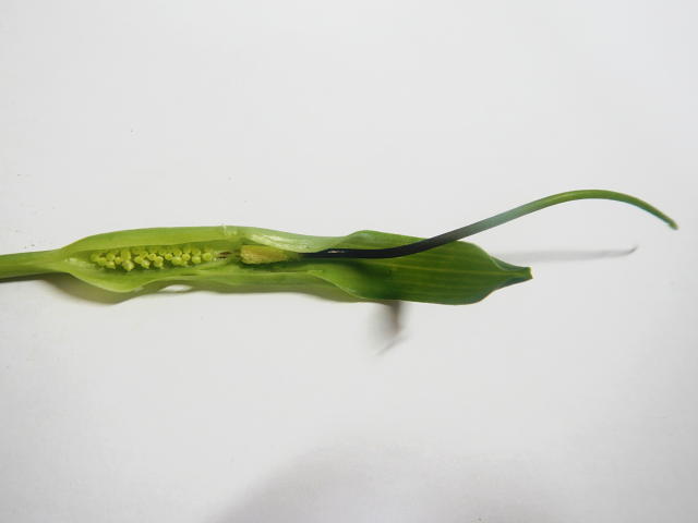 カラスビシャク 仏炎苞(内部の左から雌花群、雄花群、花序付属体)