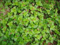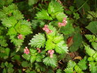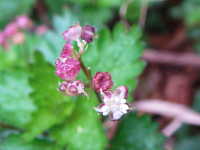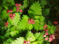 特徴:菱形で鋸歯のある葉と小さい赤い蕾、白い花。