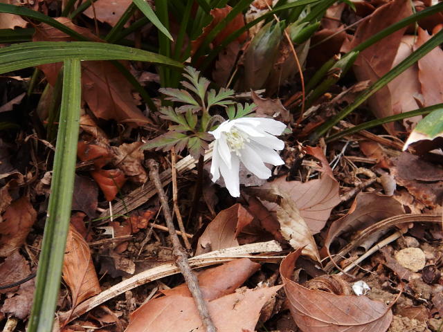 キクザキイチゲ 葉は3枚輪生で、深い切れ込みがある