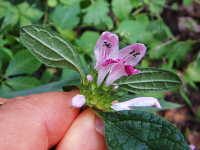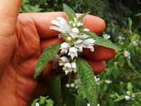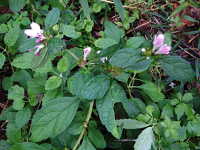 | 多年草 草丈:60cm〜100cm 花期:8月〜9月 生育場所:丘陵の日当たりの良い草地など 特徴:白い花が数個ずつ上部の葉腋につく。花冠は唇形。葉は粗い鋸歯のある卵形で、先端部は鋸歯の無い長楕円形。 名前の由来:花に白い毛が多いので、それを綿に見立てて「 |