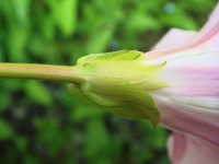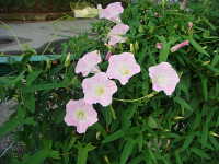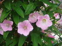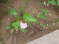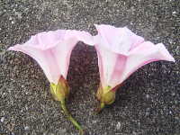| 多年草 つる性 花期:5月〜8月 生育場所:庭、空き地など 特徴:薄桃色の花がきれい。ヒルガオと葉と花柄の形状がわずかに異なる。 名前の由来:アザガオに似るが、昼になっても花がしぼまないため「ヒルガオ」。ヒルガオより花がやや小さいため「コ」が付く。 |