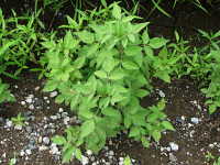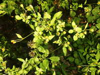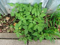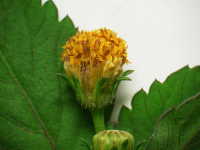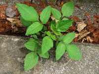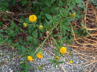 特徴:上位葉は3枚、下位葉は5枚の小葉からなる羽状複葉。茎は紫色で四角形。花は黄色い管状花のみからなる。
