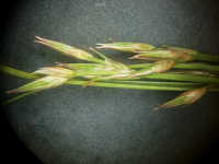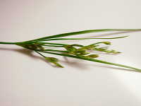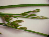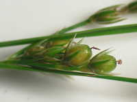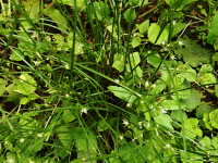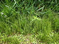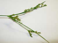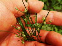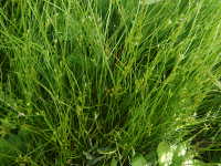 | 多年草 草丈:30〜50cm 花期:6月〜8月 生育場所:公園などで人がよく通る場所(踏みつけに強い)など。 特徴:極細の葉の先端に花序をつけ、卵形の果実をつける。 名前の由来:細い葉をつけ、いわゆる草の形態をしたイグサ科の植物という意味。 |