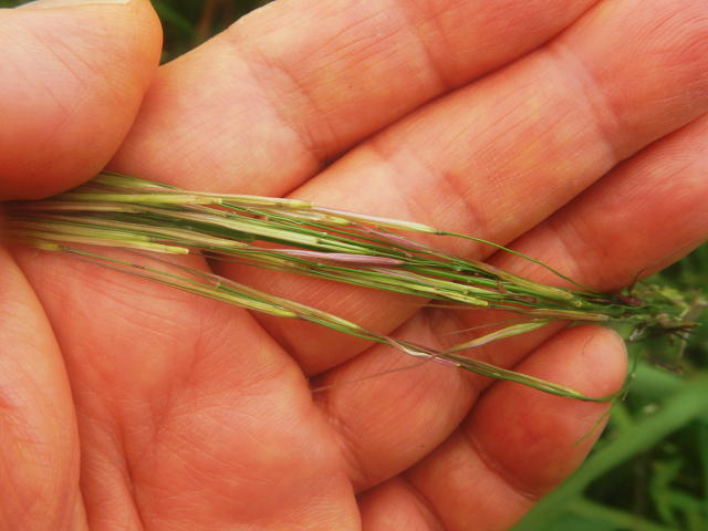 マコモ 薄紫色の雄小穂と黄緑色の雌小穂