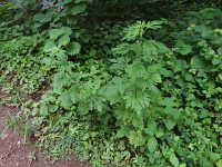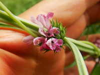 特徴:赤紫色の小さい花が上部の葉腋に輪状に多数つく。葉は深い切れ込みがある。