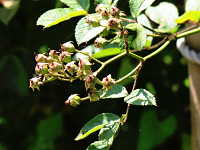 特徴:葉は園芸種のバラ科特有の奇数羽状複葉で、若い幹や葉軸にトゲがある。 白い花が咲き、赤い果実ができる。