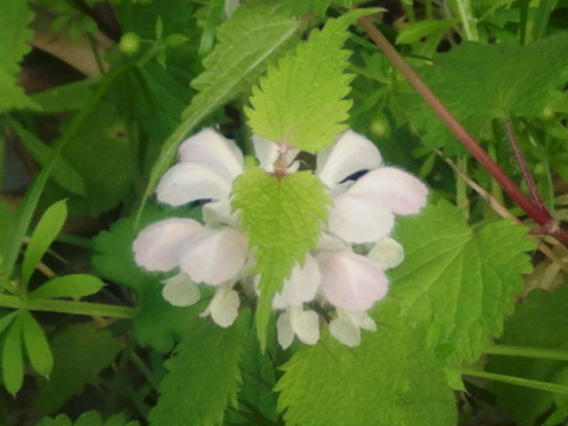 オドリコソウ 上唇はかぶと状で下唇は突き出して先が2つに分かれる
