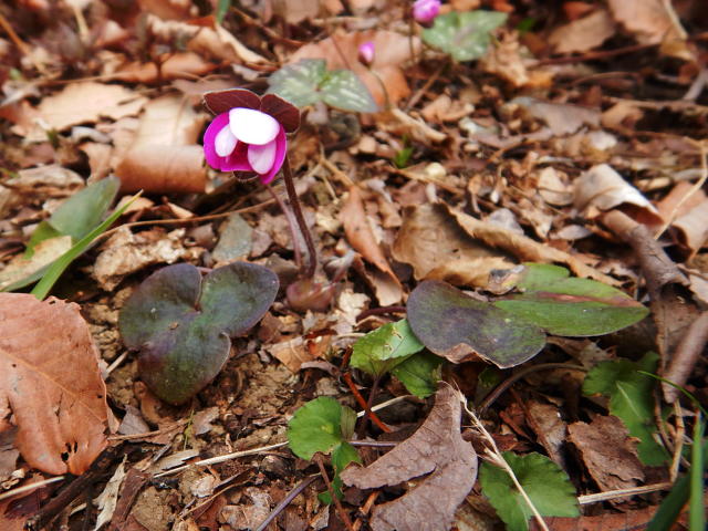 オオミスミソウ 開き始めた花と3浅裂の三角形の葉(3月上旬)