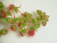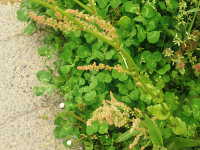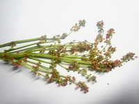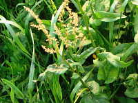 特徴:小さい花を多数付ける黄橙色の花序。下位葉は矢じり形。雌雄異株