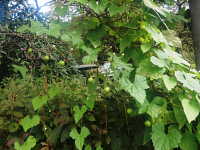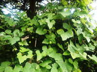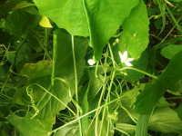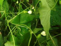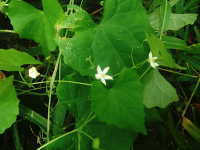 | 1年草 つる性植物 花期:8月〜9月 生育場所:湿った道はた、林縁など 特徴:キュウリに似た形の小さい葉で、巻きひげが多く、周辺の植物に絡みつく。 名前の由来:果実がカラスウリより小さいため、「スズメ」という名が付いた。 |
