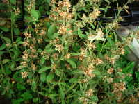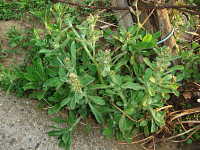 特徴:株全体に綿毛が多い。葉が他のハハコグサの仲間より丸みを帯びている。葉の付け根に赤茶色〜褐色の頭花を付ける 。