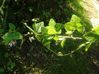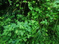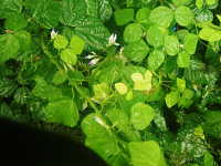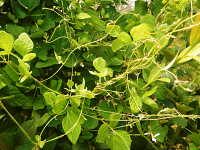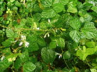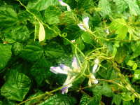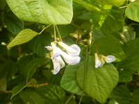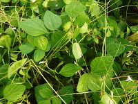 | 1年草 つる性植物 花期:9月〜10月 生育場所:空き地、林縁など 特徴:ダイズに似た葉で、つるが伸びて繁茂する。薄紫色の筒状の小さい花が咲き、莢が付く。 名前の由来:ヤブに生えるマメ。 |