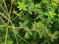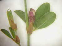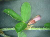 特徴:葉は楕円形の3小葉で、葉腋に小さい赤紫色の花がつく。