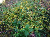 | 越年草 草丈:30cm〜120cm 花期:10月〜11月 生育場所:野原、日当たりの良い山野など 特徴:枝先や上部の葉腋に直径15mmの黄色の花を多数つける。 名前の由来:葉の形が薬師如来の |
