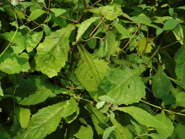 ヤクシソウ 長楕円形の葉の基部は後方に張り出して茎を抱く