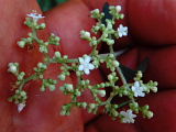 ・花:小さくて左右相称で、集散花序(花軸の先端に花を付け、その下から出た枝の先端に花を付ける花序)。